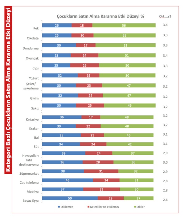 Araştımanın bir diğer çarpıcı sonucu ise her 10 anneden yaklaşık sekizi (%75) ürün alışverişinde çocuklarının tercihlerinden etkileniyor. Bu etkilenmenin kırsal bölgelerde yaşayan annelerde daha fazla olduğu görülüyor. Ortalama etkilenme skorunun en yüksek olduğu kategoriler oyuncak ve kek (3,4). Çocukların satın almada en az etkisi olduğu kategoriler ise cep telefonu ve (2,8) ve beyaz eşya (2,6).