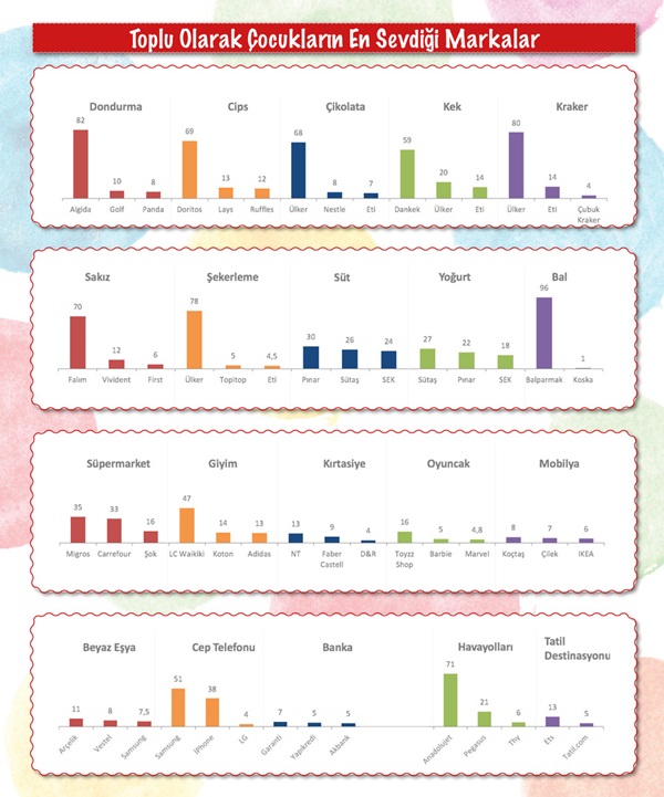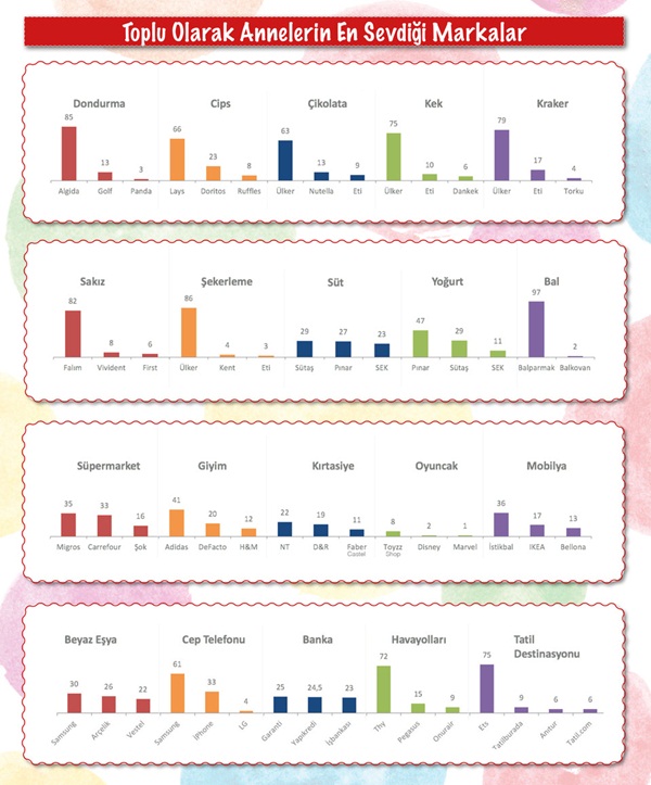 Annelere genel anlamda kendilerinin ve çocuklarının en sevdiği markalar soruldu. Annelere göre çocuklarının en fazla sevdiği markalar sıralamasında LC Waikiki %36 ile açık ara ilk sırada yer alıyor. LC Waikiki’yi %11 ile Adidas, %9 ile Ülker takip ediyor. Annelere göre ise en beğenilen marka %19 ile Ülker. Diğer iki marka ise Adidas (%12) ve Nike (%11). Çocukların ve annelerinin en sevdiği markaların uyumuna bakıldığında, annelere göre çocukların %20’sinin, anneleriyle aynı markayı ‘’en çok sevdiği marka’’ olarak benimsedikleri gözlemleniyor. Adidas, anne ve çocuk marka uyumunda %6’lık oranıyla anne-çocuk sevgisini aynı anda kazanmış en başarılı marka olarak ortaya çıkıyor.