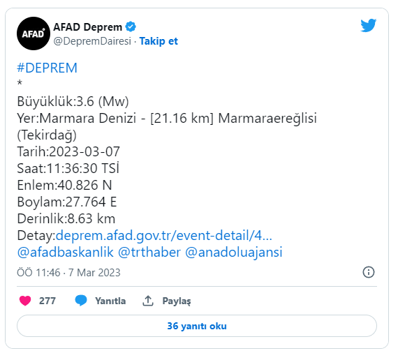 AFAD verilerine göre; Tekirdağ Marmaraereğlisi'nde saat 11.36'da 3.6 büyüklüğünde deprem meydana geldi. Deprem yerin 8 kilometre derinliğinde gerçekleşti.