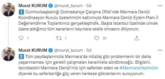 Çevre, Şehircilik ve İklim Değişikliği Bakanı Murat Kurum, Cumhurbaşkanlığı Dolmabahçe Çalışma Ofisi'nde Marmara Denizi Koordinasyon Kurulu üyelerinin katılımıyla Marmara Denizi Eylem Planı İl Değerlendirme Toplantısını gerçekleştirdiklerini duyurdu. Kurum sosyal medya hesabı üzerinden yaptığı paylaşımda, “Cumhurbaşkanlığı Dolmabahçe Çalışma Ofisi'nde Marmara Denizi Koordinasyon Kurulu üyelerimizin katılımıyla Marmara Denizi Eylem Planı İl Değerlendirme Toplantımızı gerçekleştirdik. Başta İstanbul özelinde olmak üzere aldığımız tüm kararların hayırlara vesile olmasını diliyorum. Tüm paydaşlarımızla Marmara'da müsilaj gibi problemlerin bir daha yaşanmaması için gerekli çalışmaları kararlılıkla sürdüreceğiz. Bilgisini, tecrübesini Marmara Denizi'miz için seferber eden ve #MarmaraHepimizin diyerek bu seferberliğe güç veren herkese şükranlarımı sunuyorum” ifadelerini kullandı.
