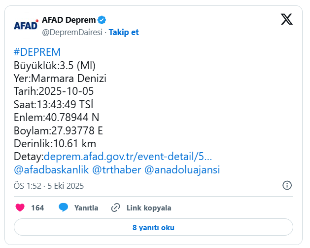 Afet ve Acil Durum Yönetimi Başkanlığının internet sitesinde yer alan bilgiye göre, merkez üssü Marmara Denizi olan 3,5 büyüklüğünde sarsıntı kaydedildi.
