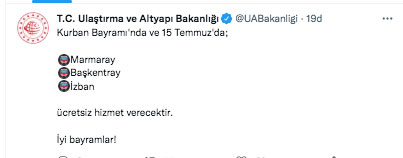Ulaştırma Bakanlığı, Kurban Bayramı ve 15 Temmuz'da Marmaray, Başkentray ve İZBAN'ın ücretsiz hizmet vereceğini açıkladı. Kurban Bayramı'nda devletin işlettiği köprü ve otoyollardan da ücret alınmayacağı açıklanmıştı. Böylece bayram boyunca İstanbul'daki 15 Temmuz Şehitler Köprüsü ile Fatih Sultan Mehmet Köprüsü ücretsiz olacak. Yavuz Sultan Selim Köprüsü, Osmangazi Köprüsü ve 1915 Çanakkale Köprüsü bayram süresince ücretli olacak.