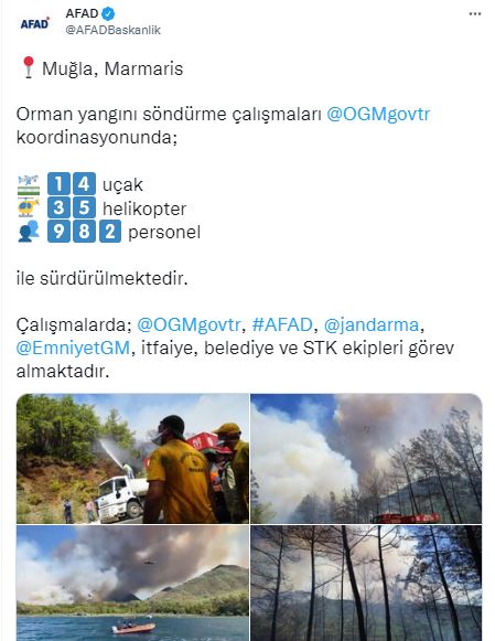Afet ve Acil Durum Yönetimi Başkanlığı (AFAD) resmi sosyal medya hesabından yapılan paylaşımda ifadelerine yer verildi; “14 uçak, 35 helikopter, 982personel ile sürdürülmektedir. Çalışmalarda; @OGMgovtr, #AFAD,@jandarma,@EmniyetGM, itfaiye, belediye ve STK ekipleri görev almaktadır.”