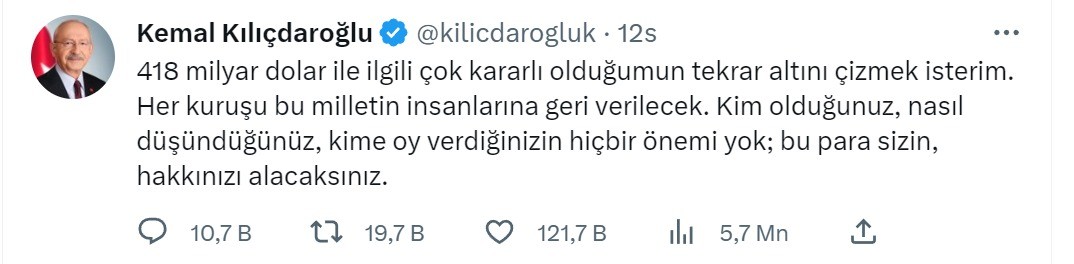 "418 milyar dolar ile ilgili çok kararlı olduğumun tekrar altını çizmek isterim. Her kuruşu bu milletin insanlarına geri verilecek. Kim olduğunuz, nasıl düşündüğünüz, kime oy verdiğinizin hiçbir önemi yok; bu para sizin, hakkınızı alacaksınız."