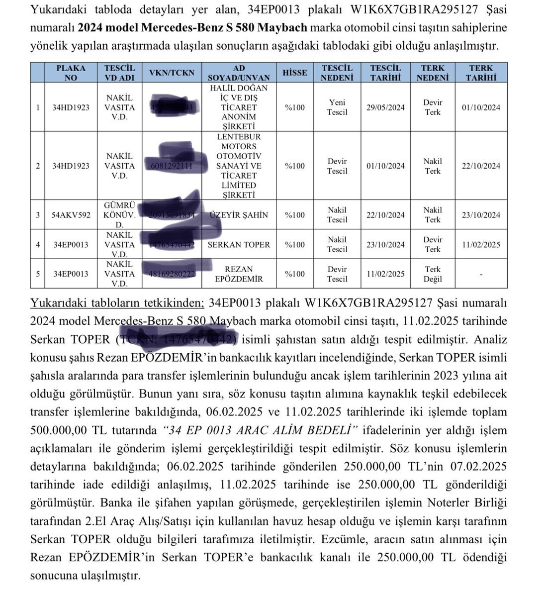 Rapora yansıyan detaylara göre; 34 EP 0013 plakalı 2024 model Mercedes-Benz S 580 Maybach, Epözdemir tarafından önce makam şoförünün üzerine yapıldı. Lüks araç, şoförün üzerinde sadece 1 gün kaldıktan sonra hızla farklı bir üçüncü şahsa devredildi. 4 ay boyunca bu kişide kalan aracın, sürenin sonunda yeniden Rezan Epözdemir adına tescil edilmesi "Bu neyin trafiği?" dedirtti.