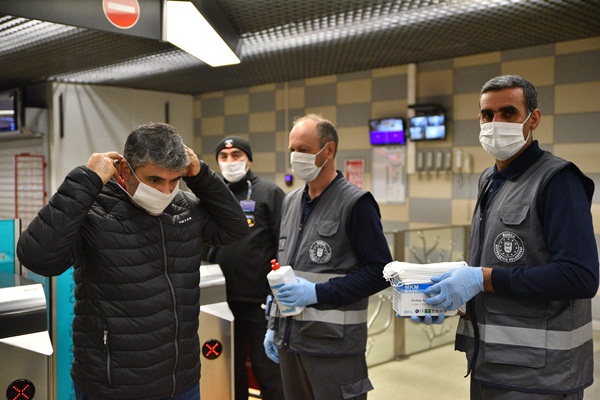 Bursa Büyükşehir Belediyesi ekipleri, ‘koronavirüsle mücadele çalışmaları kapsamında’ metro hatları, toplu taşıma araçları, pazar yerleri ve kent meydanlarında vatandaşlara ücretsiz maske dağıttı.