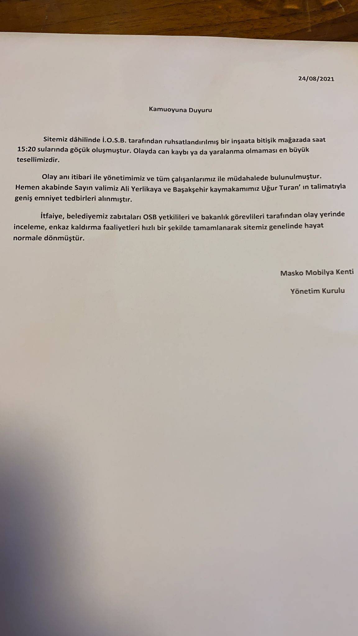 'Sitemiz dahilinde İ.O.S.B tarafından ruhsatlandırılmış birinşaata bitişik mağazada saat 15.20 sularında göçük oluşmuştur. Olayda can kaybı ya da yaralanma olmaması en büyük tesellimizdir.