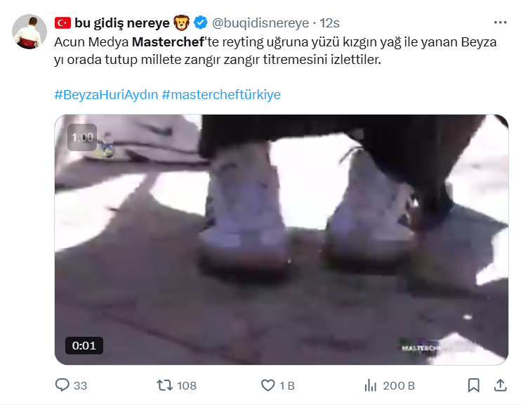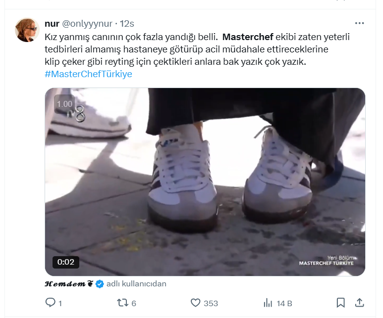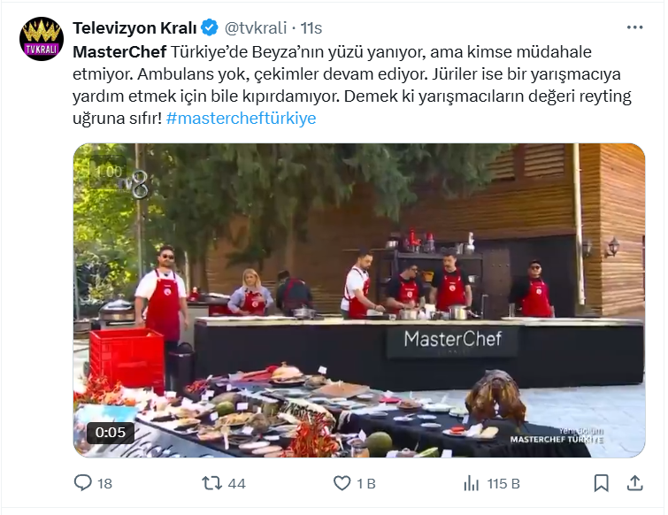 Acun Ilıcalı’nın sahibi olduğu TV8’de yayınlanan MasterChef isimli yarışma programında bir yarışmacının yüzüne kızgın yağ döküldü. Yarışmacının eline, yüzüne tutsun diye alelade buz verildi, ambulans vs. çağırılmadı ve çekimler devam etti. Zor durumdaki yarışmacının titrediği anları da reyting için ekrana getirdiler. Görüntüler kamuoyunda tepkiye neden oldu.