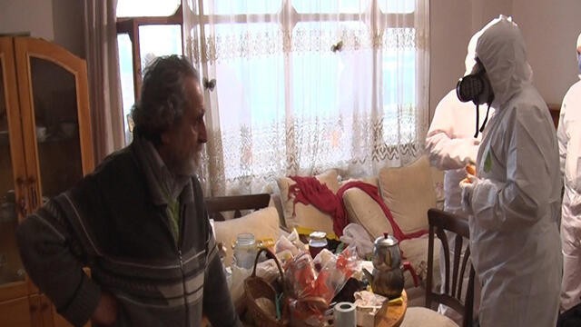 İhbar üzerine olay yerine gelen belediye ekipleri üstlerine özel koruyu kıyafetlerini giyip gaz maskeleriyle binaya girdiler.