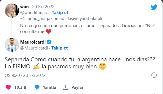 Mauro Icardi de Nara'nın tweetinin altına, "Birkaç gün önce Arjantin'e geldiğimde ayrıldığımız gibi mi? Harika zaman geçirdik" yanıtını bıraktı.