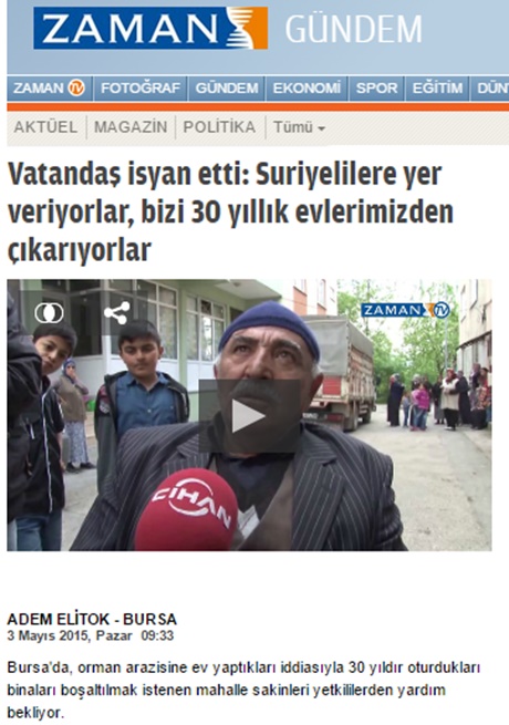 Bursa'da orman arazisinde yapılaşmaya gittikleri gerekçesi ile mahkeme kararı ile "evlerinizi boşaltın" tebligatı gelen vatandaşların yetkililere yaptıkları çağrıyı çarpıtarak haberleştiren Zaman gazetesi ülkemize sığınan Suriyelileri hedef gösterdi.