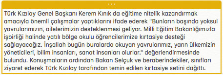 Bütün çocuklara fırsat eşitliği sağlamak istediklerini dile getiren Selçuk, şöyle devam etti: "Çocuklarımızın elinden tutmak, onların yolunu aydınlatmak bizim en öncelikli vazifelerimiz arasında. Burada başarı hikayeleri çıkacak ki bu toprakların başarı hikayeleri biriksin. Buradan memleketimizin geleceği için parlak başarılar ortaya çıkacak ki bizim ülke olarak geleceğimiz aydınlansın. İşte bu nedenle Milli Eğitim Bakanlığı (MEB) olarak yatılı bölge okullarındaki bütün çocuklarımıza 25 gigabyte internet paketi olan tablet dağıtıyoruz. Bu büyük ölçüde tamamlandı. Bu çalışmayı tamamlayıcı bir unsur olarak da ikinci bir husustan söz ediyoruz, bugün Kızılay ile beraber bu çocuklarımıza kırtasiye setlerinin temini ve çocuklarımızın tüm ihtiyaçlarının giderilmesi noktasında bir çalışmayla karşı karşıyayız."