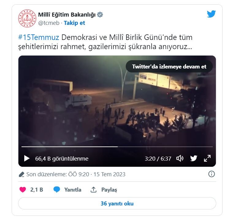 Milli Eğitim Bakanlığı 15Temmuz Demokrasi ve Millî Birlik Günü'ne özel video yayımladı. Videoyu tiyatro sanatçısı Tamer Karadağlı seslendirdi.