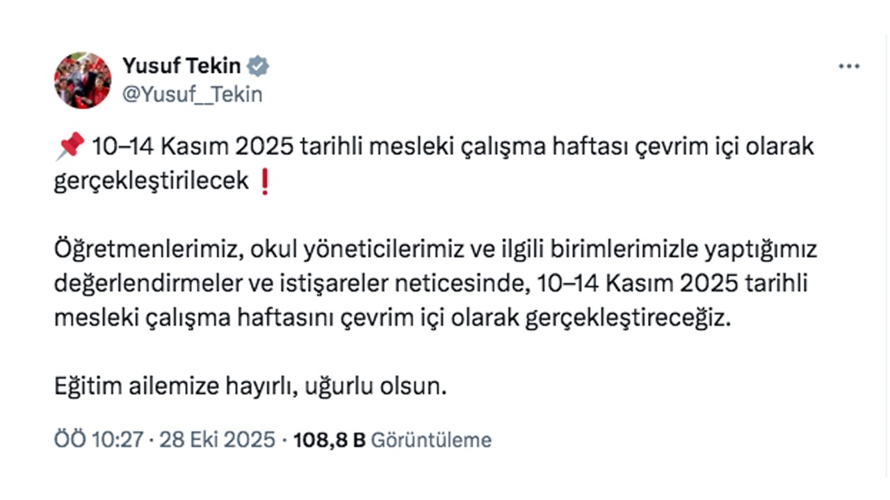 Bakan Tekin paylaşımında, “Öğretmenlerimiz, okul yöneticilerimiz ve ilgili birimlerimizle yaptığımız değerlendirmeler ve istişareler neticesinde, 10–14 Kasım 2025 tarihli mesleki çalışma haftasını çevrim içi olarak gerçekleştireceğiz. Eğitim ailemize hayırlı, uğurlu olsun” ifadelerine yer verdi.