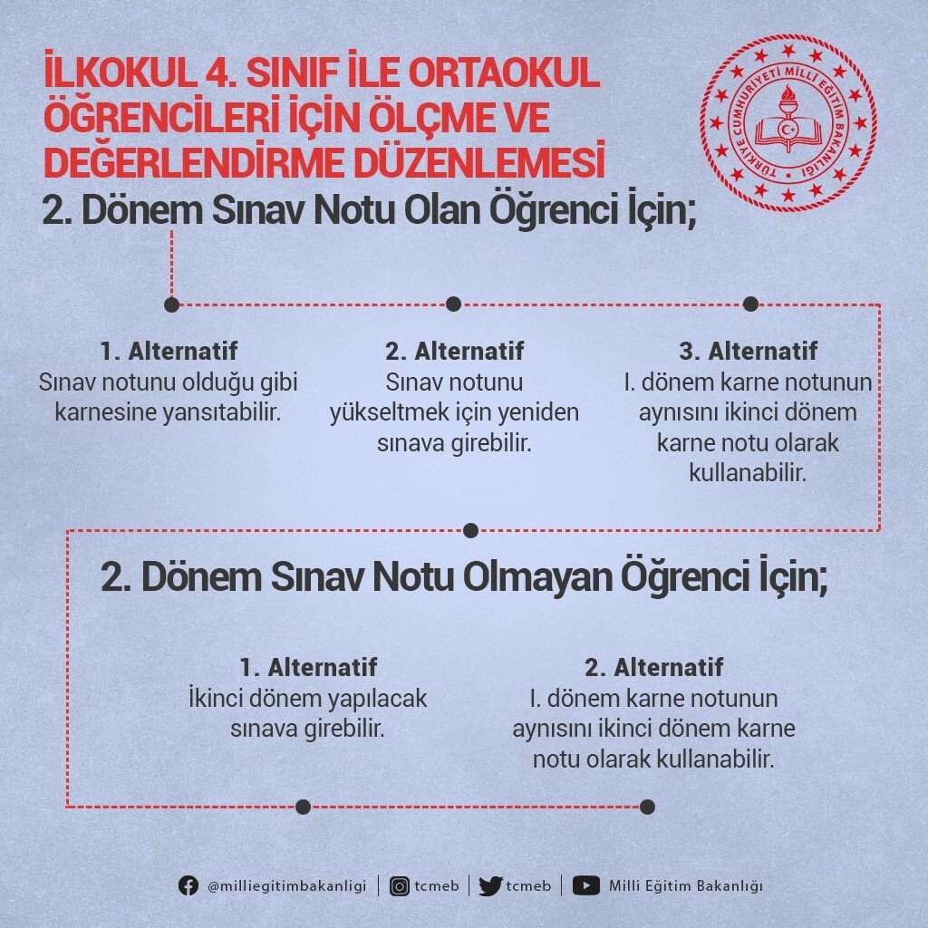 Açıklamada, İlkokul 1, 2 ve 3'üncü sınıflarda sınav uygulaması bulunmadığı vurgulanırken "Öğrencilerimiz, birinci dönemde olduğu gibi yüz yüze eğitim, canlı ders ve/veya TRT EBA televizyonundaki yayınları takip ve derse olan ilgilerine göre kişisel, sosyal ve akademik gelişimlerini destekleyecek şekilde öğretmenleri tarafından değerlendirilecektir." denildi.