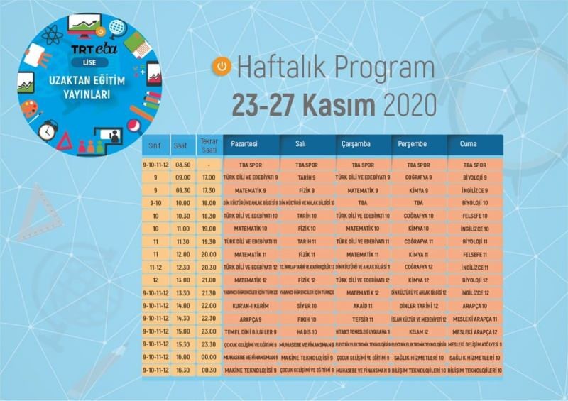 Milli Eğitim Bakanlığı (MEB) sosyal medya hesabından yaptığı paylaşımda, "Ara tatil bitti, uzaktan eğitim kaldığı yerden devam ediyor. TRT EBA’da yeni haftanın programı hazır. İlkokul, ortaokul ve lise kanalları yine dopdolu. İşte, 23-27 Kasım haftasının akışı" ifadeleri ile birlikte ara tatil sonrası yeniden başlayan uzaktan eğitimde ilk haftanın programını paylaştı.