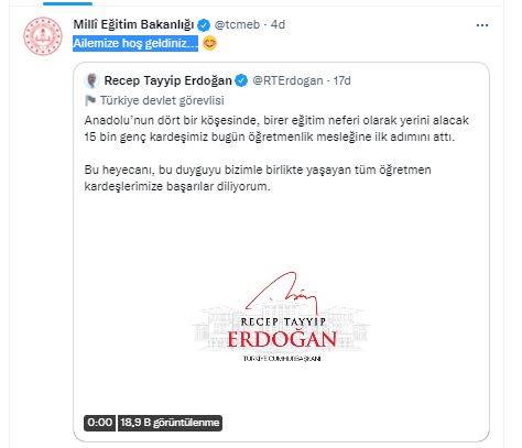 Paylaşımda, Cumhurbaşkanı Recep Tayyip Erdoğan’ın “Anadolu’nun dört bir köşesinde, birer eğitim neferi olarak yerini alacak 15 bin genç kardeşimiz bugün öğretmenlik mesleğine ilk adımını attı. Bu heyecanı, bu duyguyu bizimle birlikte yaşayan tüm öğretmen kardeşlerimize başarılar diliyorum” ifadelerine yer verilerek, yeni atanan öğretmenlere “Ailemize hoş geldiniz...” denildi.