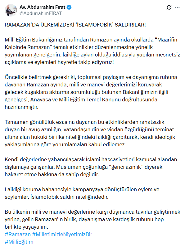 AK Parti Erzurum Milletvekili Avukat Abdurrahim Fırat, Milli Eğitim Bakanlığı'nın (MEB) Ramazan ayı için okullarda düzenlediği “Maarifin Kalbinde Ramazan” temalı etkinliklere saldıran muhalifleri eleştirdi. Fırat, bu etkinliklere yönelik muhalif kesimlerden gelen eleştirileri "mesnetsiz" ve "İslamofobik" olarak nitelendirerek, laiklik ilkesinin çarpıtıldığını vurguladı.