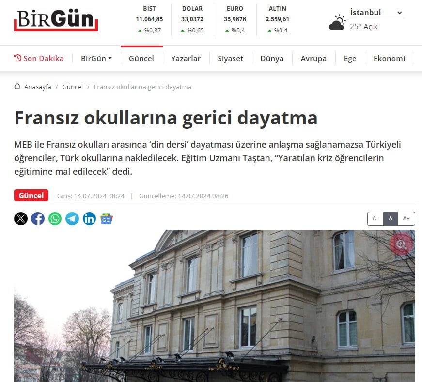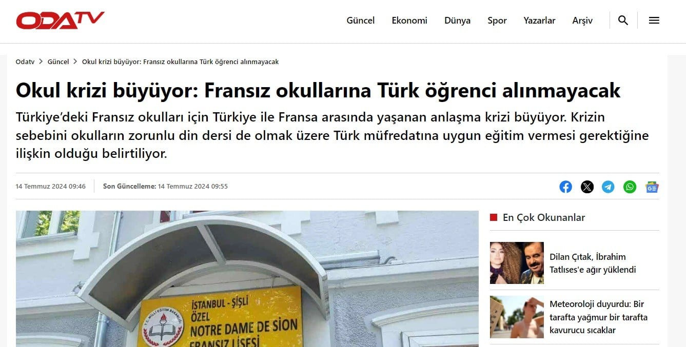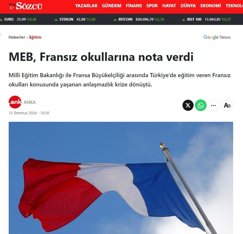Fransa’nın Ankara Büyükelçiliği, MEB’in kendilerine sunduğu anlaşmanın imzalanmaması halinde okullarına Türkiyeli öğrenci alınamayacağını açıklaması sonrası, başını Sözcü, Oda TV ve Birgün’ün çektiği mandacı zihniyetin medya ayağı Fransa tarafında saf tuttu.