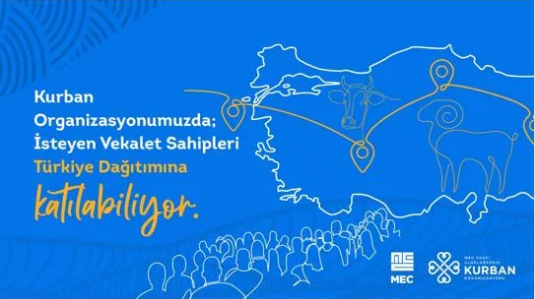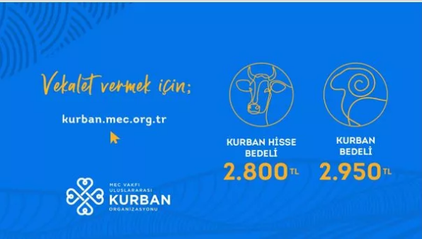 MEC Vakfı 17. Uluslararası Kurban Organizasyonunda Türkiye’de kesimi yapılacak ve Türkiye’de dağıtımı yapılacak kurbanlıklar için Büyükbaş Kurban Hisse Bedeli 2.800 TL, Küçükbaş Kurban Bedeli 2.950 TL olarak belirlendi.