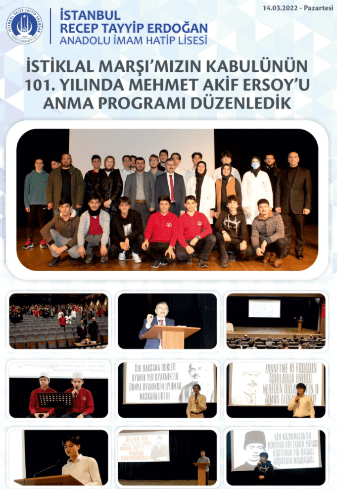 İstanbul Recep Tayyip Erdoğan Anadolu İmam Hatip Lisesi, İstiklal Marşımızın kabulünün 101. yıldönümünde merhum şairimiz Mehmet Akif Ersoy'u anma programı düzenledi.