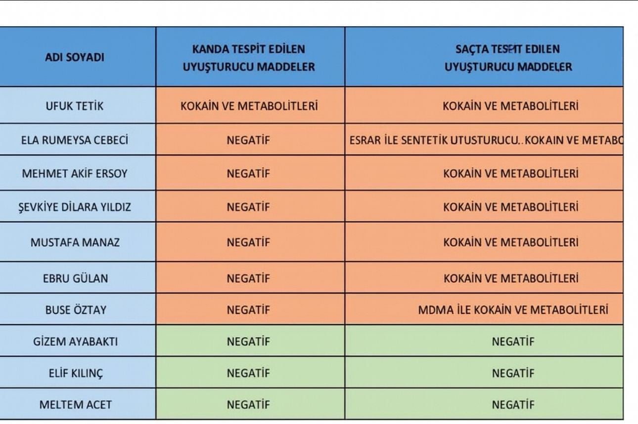 Kokain kullananlar arasında, Ufuk Tetik, Ela Rümeysa Cebeci, Mehmet Akif Ersoy, Dilara Yıldız, Mustafa Manaz, Ebru Gülan ve Buse Öztay yer aldı.
