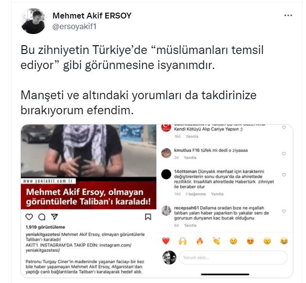 Kabil'e giderek elinde olmayan görüntülerle, "Burada kadınlara kırbaçla müdahale ediyorlar, sokaklardaki çocuklar korkudan ağlıyorlar." ifadelerini kullanıp, Taliban'ı karalayan Mehmet Akif Ersoy, twitter hesabından Yeni Akit'i hedef aldı.