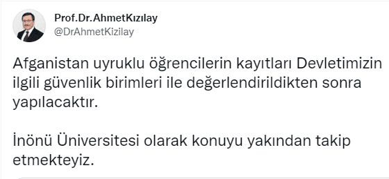 İnönü Üniversitesi Rektörü Prof. Dr. Ahmet Kızılay, ilk cevabını twitter hesabından yaptığı paylaşımla verdi. Prof. Kızılay, "Afganistan uyruklu öğrencilerin kayıtları Devletimizin ilgili güvenlik birimleri ile değerlendirildikten sonra yapılacaktır." dedi.