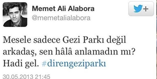 Seçilmiş hükümeti yıkmak için Gezi kalkışması gerçekleştirenlerin başında gelen ve gezi olayları sırasında attığı 'Mesele sadece Gezi Parkı değil arkadaş, sen hala anlamadın mı?'twitle amacın ne olduğunu dile getiren sözde oyuncu Mehmet Ali Alabora hakkında yakalama kararı çıkartıldı.