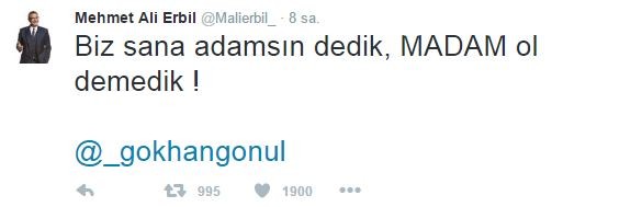 Mehmet Ali Erbil, Gökhan Gönül için, "Biz sana adamsın dedik, MADAM ol demedik!" ifadesini kullandı. Twitter'da 147 bin takipçisi bulunan ünlü şovmenin bu tweeeti sosyal medyada büyük yankı yarattı. 946 kişinin retweet ettiği bu mesajı bin 800 kişi beğendi. Buna karşın bir o kadar da tepki tweet'i geldi.