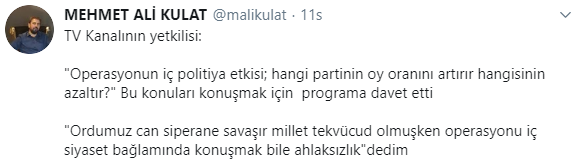 Kişisel Twitter hesabından isim vermeden bir kanalın kendisini davet ettiğini ve yayında harekatın en çok hangi partiye yarayacağını değerlendirmesini talep ettiğini ifade eden Kulat, “Ordumuz can siperhane savaşır, millet tek vücut olmuşken operasyonu iç siyaset bağlamında konuşmak bile ahlaksızlık” sözleriyle reddettiğini duyurdu.