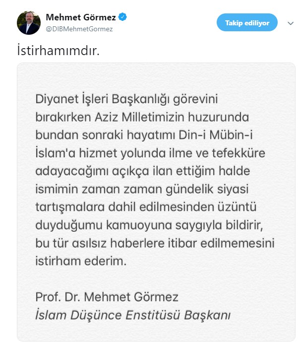 "Diyanet İşleri Başkanlığı görevini bırakırken Aziz Milletimizin huzurunda bundan sonraki hayatımı Din-i Mübin-i İslam'a hizmet yolunda ilme ve tefekküre adayacağımı açıkca ilan ettiğim halde ismimin zaman zaman gündelik siyasi tartışmalara dahil edilmesinden üzüntü duyduğumu kamuoyuna saygıyla bildirir, bu tür asılsız haberlere itibar edilmemesini istirham ederim."
