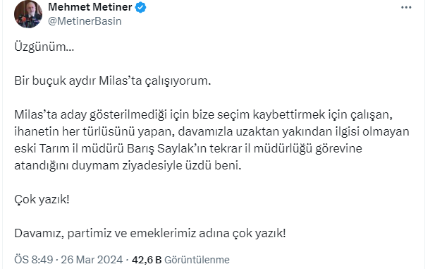 Metiner yaptığı açıklamada, "Üzgünüm. Bir buçuk aydır Milas’ta çalışıyorum. Milas’ta aday gösterilmediği için bize seçim kaybettirmek için çalışan, ihanetin her türlüsünü yapan, davamızla uzaktan yakından ilgisi olmayan eski Tarım il müdürü Barış Saylak’ın tekrar il müdürlüğü görevine atandığını duymam ziyadesiyle üzdü beni. Çok yazık! Davamız, partimiz ve emeklerimiz adına çok yazık!" dedi.