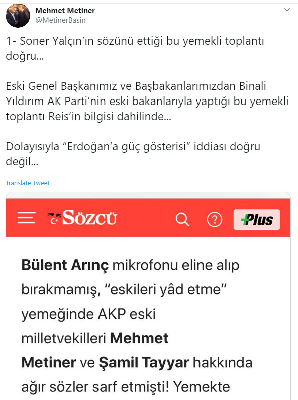 "Bülent Arınç mikrofonu eline alıp bırakmamış, ‘eskileri yâd etme’ yemeğinde AKP eski milletvekilleri Mehmet Metiner ve Şamil Tayyar hakkında ağır sözler sarf etmişti! Yemekte bulunan kimileri ‘burası yeri değil’ dese de Bülent Arınç'ın konuşmasını sürdürmesi üzerine bazıları yemeği terk etmişti. Bülent Arınç'ın yemeği sabote etmesi Binali Yıldırım'ın keyfini kaçırmış ve yemeğin erken bitmesine sebep olmuştu…"