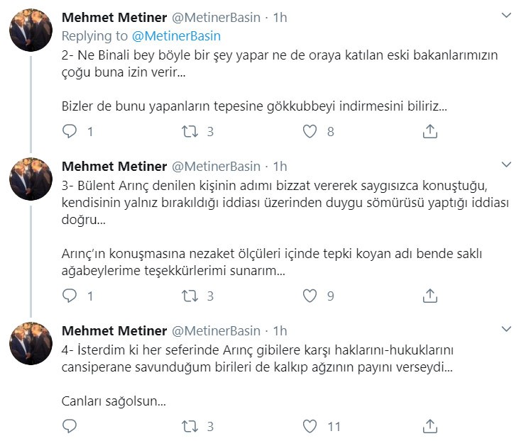 Metiner, sosyal medya hesabından yaptığı açıklamada “Bülent Arınç denilen kişinin adımı bizzat vererek saygısızca konuştuğu, kendisinin yalnız bırakıldığı iddiası üzerinden duygu sömürüsü yaptığı iddiası doğru...” ifadelerini kullandı.