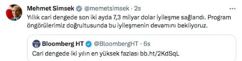 Hazine ve Maliye Bakanı Mehmet Şimşek, yıllık cari dengede son iki ayda 7,3 milyar dolar iyileşme sağlandığını bildirerek, "Program öngörülerimiz doğrultusunda bu iyileşmenin devamını bekliyoruz." ifadesini kullandı.