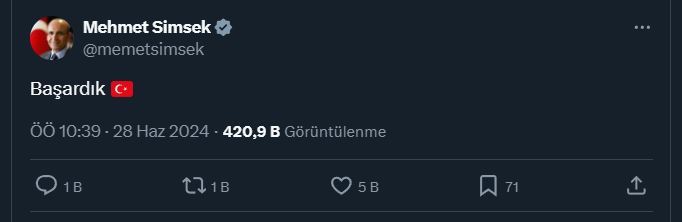 Yaşanan gelişmenin ardından sosyal medyadan paylaşım yapan Şimşek, "Başardık" ifadesini kullandı.