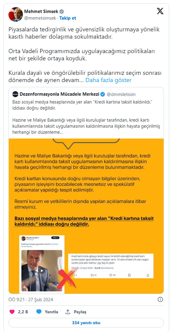 Şimşek, sosyal medya hesabından yaptığı açıklamada "Piyasalarda tedirginlik ve güvensizlik oluşturmaya yönelik kasıtlı haberler dolaşıma sokulmaktadır. Orta Vadeli Programımızda uygulayacağımız politikaları net bir şekilde ortaya koyduk. Kurala dayalı ve öngörülebilir politikalarımız seçim sonrası dönemde de aynen devam edecektir. Bu çerçevede vatandaşlarımızdan istirham ediyorum; lütfen bizden duymadığınız hiçbir habere itibar etmeyiniz" dedi.
