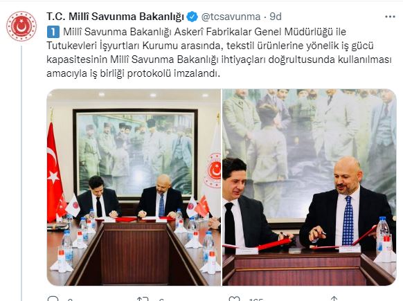 Bakanlığın resmi Twitter hesabından yapılan paylaşımla, Türk silahlı Kuvvetleri’nin askeri kıyafet ve diğer tekstil ürünleri Adalet Bakanlığı ile yapılan anlaşmayla bir kısmının tutuk evlerindeki iş yurtlarında üretileceği duyuruldu. Bakanlığın sosyal medya hesabından yapılan paylaşımda şu ifadelere yer verildi; “Millî Savunma Bakanlığı Askerî Fabrikalar Genel Müdürlüğü ve Adalet Bakanlığı Ceza İnfaz Kurumları ile Tutukevleri iş yurtları Kurumu arasında, tekstil ürünlerine yönelik iş gücü kapasitesinin Millî Savunma Bakanlığı ihtiyaçlarına yönelik olarak kullanılması maksadıyla bir iş birliği protokolü imzalanmıştır. Bu protokol kapsamında İş yurtları, mevcut kabiliyetlerini kullanarak ve sonrasında ilave kabiliyetler de kazanarak Türk Silahlı Kuvvetlerinin askerî kıyafet ve diğer tekstil ürünleri ihtiyaçlarının karşılanmasına yönelik üretimler gerçekleştirecektir.”