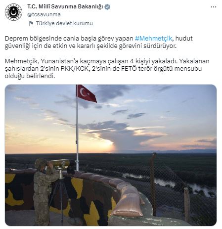 MSB’nin sosyal medya hesabından yapılan paylaşımda, “Deprem bölgesinde canla başla görev yapan Mehmetçik, hudut güvenliği için de etkin ve kararlı şekilde görevini sürdürüyor. Mehmetçik, Yunanistan’a kaçmaya çalışan 4 kişiyi yakaladı. Yakalanan şahıslardan 2'sinin PKK/KCK, 2'sinin de FETÖ terör örgütü mensubu olduğu belirlendi” denildi.