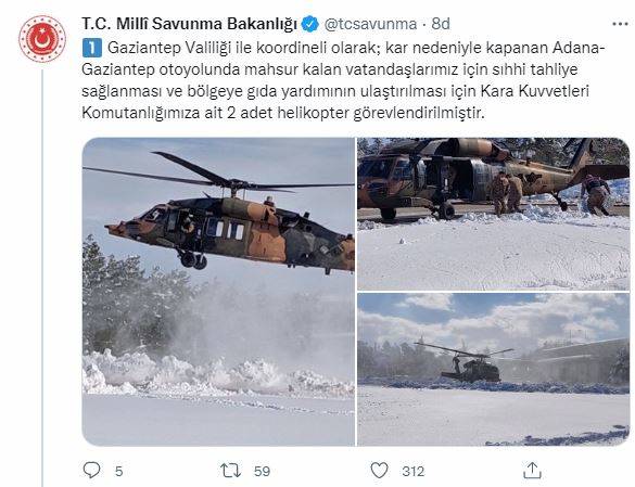Milli Savunma bakanlığının resmi Tweetir hesabından yaptığı paylaşımla Adana-Gaziantep otoyolunda kar yağışı nedeniyle mahsur kalan vatandaşların acil ihtiyaçlarını karşılamak ve kurtarmak amacıyla çalışma başlattı. Yapılan açıklamada, “Gaziantep Valiliği ile koordineli olarak; kar nedeniyle kapanan Adana-Gaziantep otoyolunda mahsur kalan vatandaşlarımız için sıhhi tahliye sağlanması ve bölgeye gıda yardımının ulaştırılması için Kara Kuvvetleri Komutanlığımıza ait 2 adet helikopter görevlendirilmiştir. Ayrıca yolda mahsur kalan TIR'ları kurtarmak için 2 adet çekici araç da görevlendirilmiş ve bölgede destek çalışmalarına başlamıştır. Türk Silahlı Kuvvetlerimiz ihtiyaç duyulması halinde tüm imkân ve kabiliyetleriyle göreve hazırdır.” ifadeler kullanılarak Mehmetçiğin her koşulda vatandaşların yanında olduğunu bir kez daha gösterdi..