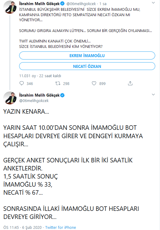 Melih Gökçek, paylaşımında, "Yazın kenara. Yarın saat 10.00'dan sonra İmamoğlu bot hesapları devreye girer ve dengeyi kurmaya çalışır. Gerçek anket sonuçları ilk 1-2 saatlik anketlerdir. İlk 1,5 saatlik sonuç, İmamoğlu yüzde 33, Necati Doğru yüzde 67'dir. Sonrasında illaki İmamoğlu bot hesapları devreye giriyor" dedi.