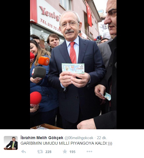 Bunun üzerine Ankara Büyükşehir Belediye Başkanı Melih Gökçek, Twitter hesabından CHP lideriyle dalga geçti. Piyango biletiyle poz veren Kılıçdaroğlu'nun fotoğrafını paylaşan Gökçek, "Garibimin umudu Milli Piyango'ya kaldı" ifadelerini kullandı.