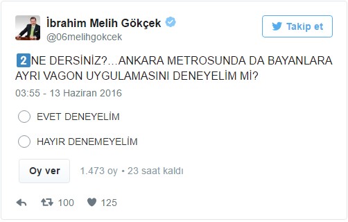 Başkan Gökçek, "Ne dersiniz? Ankara Metrosu'nda da bayanlara ayrı vagon uygulamasını deneyelim mi?" soru üzerine Twitter'dan anket çalışması başlattı.Kısa sürede çok sayıda kişi katıldı.