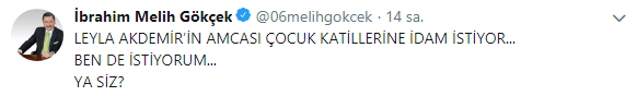 Ankara Büyükşehir Belediyesi eski Başkanı Melih Gökçek, sosyal medya hesabından, "Leyla Akdemir'in amcası çocuk katillerine idam istiyor... Ben de istiyorum... Ya siz?" paylaşımını yaptı.