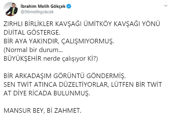 Melih Gökçek, sosyal medya hesabı üzerinden bozuk dijital göstergenin videosunu paylaşıp Mansur Yavaş'tan konuya el atmasını istedi.