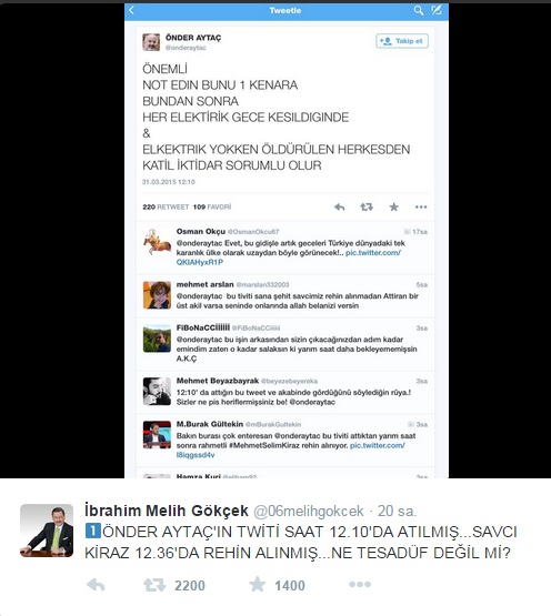 Yaşanan uzun süreli elektirik kesintisinin ardından Savcı Kiraz'ın rehin alınmasının hemen öncesinde Paralel tetikçi Önder Aytaç'ın attığı tweet dikkat çekti. Ankara Büyükşehir Belediye Başkanı Melih Gökçek, Aytaç'ın tweeti için, "Ne tesadüf değil mi?" yorumunda bulundu.
