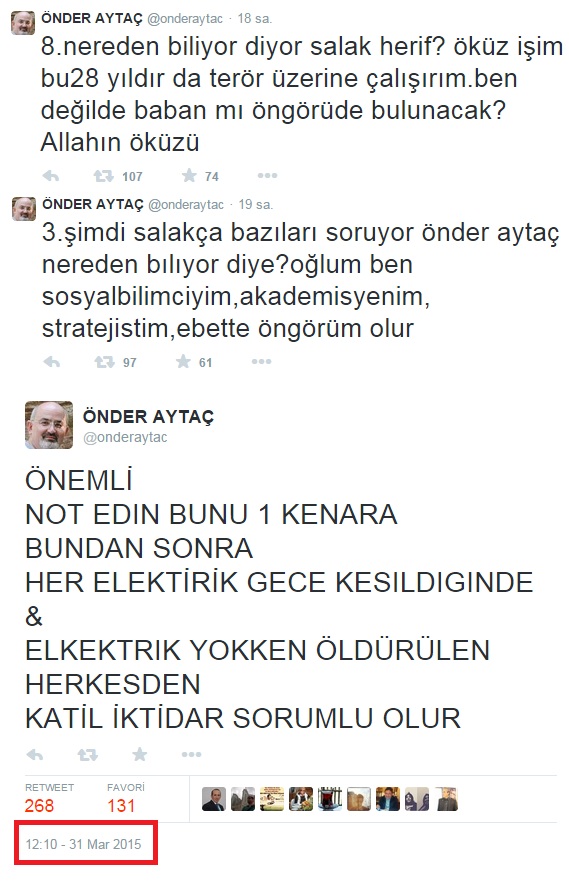 Aytaç, Twitter hesabından, "Önemli: Not edin bunu bir kenara; Her elektrik gece kesildiğinde & elektrik yokken öldürülen herkesten katil iktidar sorumlu olur" şeklinde skandal ifadeler kullanmıştı. Gökçek, bunun üzerine Twitter'dan yaptığı açıklamada, "Önder Aytaç'ın twiti saat 12:10'da atılmış. Savcı Kiraz 12:36'da rehin alınmış. Ne tesadüf değil mi?" değerlendirmesinde bulundu.