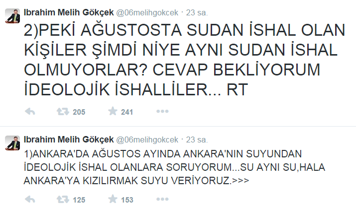 İkili arasında günlerdir süren polemikten sonra Gökçek, Aylin'e bir de soru yöneltti. Gökçek attığı twitlerde ANKARA'DA AĞUSTOS AYINDA ANKARA'NIN SUYUNDAN İDEOLOJİK İSHAL OLANLARA SORUYORUM...SU AYNI SU,HALA ANKARA'YA KIZILIRMAK SUYU VERİYORUZ, PEKİ AĞUSTOSTA SUDAN İSHAL OLAN KİŞİLER ŞİMDİ NİYE AYNI SUDAN İSHAL OLMUYORLAR? CEVAP BEKLİYORUM İDEOLOJİK İSHALLİLER, ifadelerini kullandı.