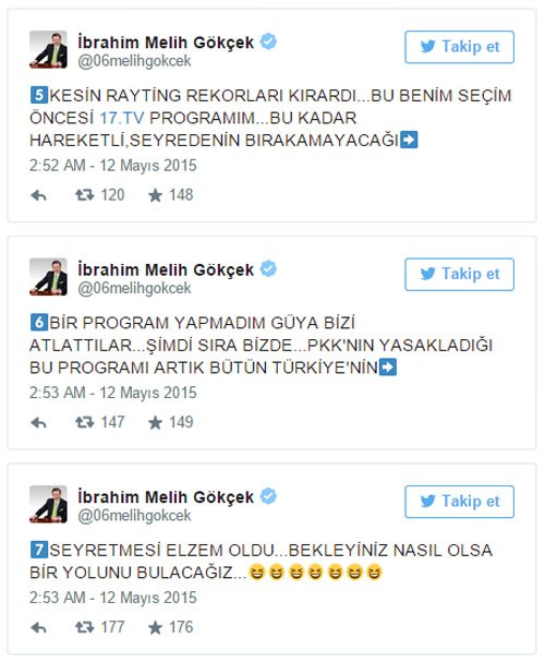 İşte Gökçek'in dün gece yaşanan yayın skandalı ile ilgili weetleri: